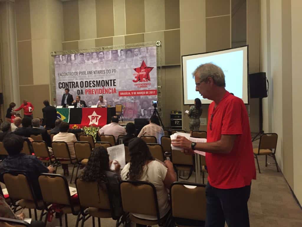 O vereador de Juiz de Fora (MG) Betão distribui o manifesto de cinco pontos:”Unidade pela reconstrução do PT” no Encontro Nacional de Parlamentares do PT Contra a Reforma da Previdência (DF)
