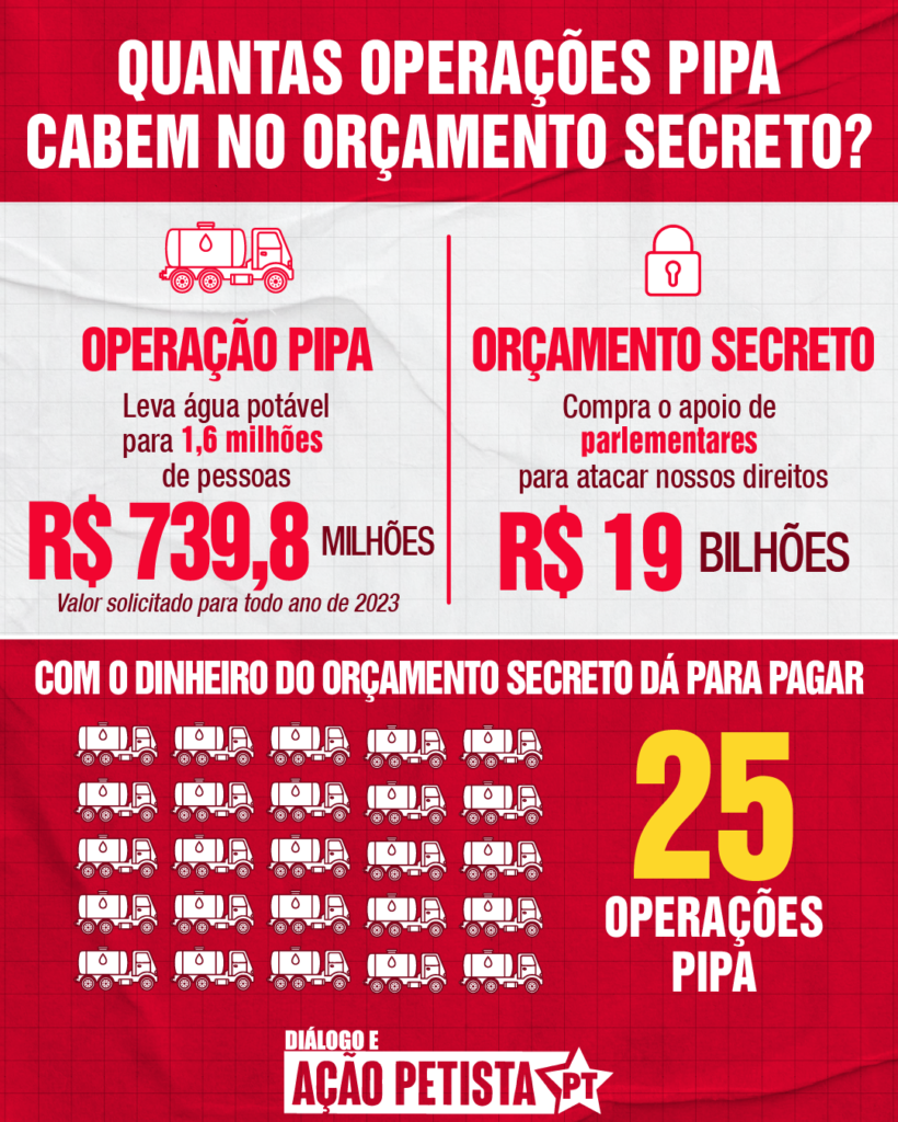 Com a desculpa de falta de recursos, o governo Bolsonaro interrompeu o abastecimento de água potável no Nordeste através da Operação Pipa. A operação leva água para as famílias no semiárido nordestino há mais de 20 anos e que atende a 1,6 milhões de pessoas. Enquanto o povo não tem acesso à água potável, o governo mantém o escabroso orçamento secreto que libera R$ 19 bilhões em emendas para os parlamentares votarem pautas que atacam os direitos dos trabalhadores.