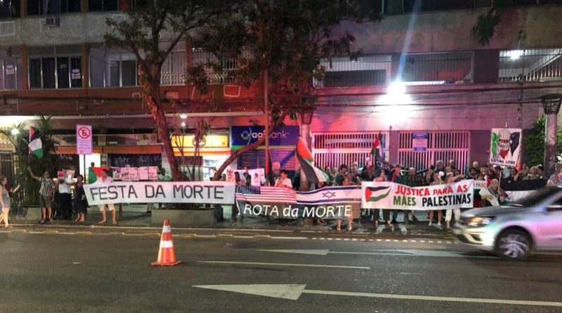 Ontem, dia 13 de maio, manifestantes estiveram em frente do Clube Hebraica, em Laranjeiras, Rio de Janeiro, para se contrapor à “festa” macabra convocada pelo Clube em aliança com a ONG sionista “Stand With Us”. A festa, apelidada pelos manifestantes como “festa da morte”, escolheu comemorar nesta data os 76 anos do Estado de Israel, na verdade, da Nakba, a “catástrofe” da expulsão de 700 mil palestinos de suas terras ancestrais em 1947-48. A “festa” ainda tinha a premiação de soldados israelenses!