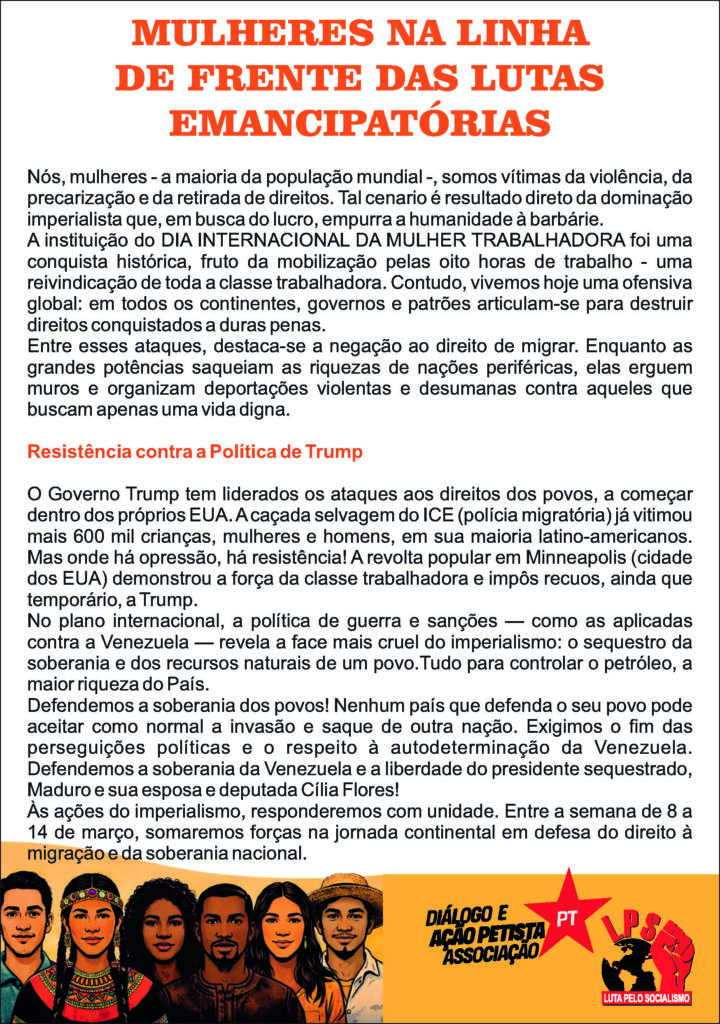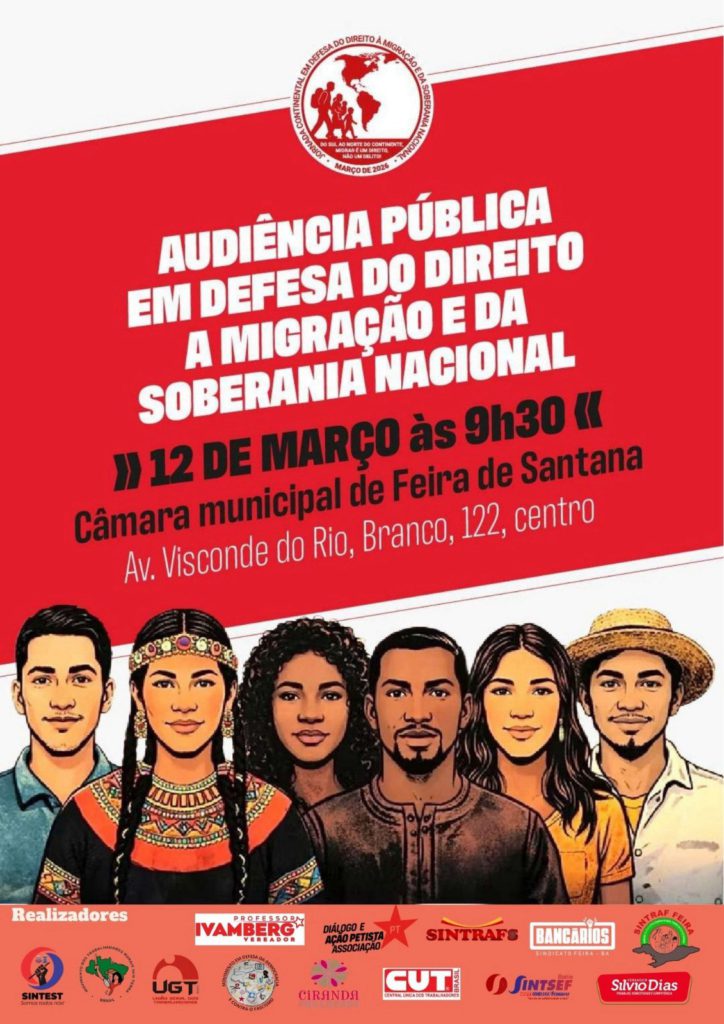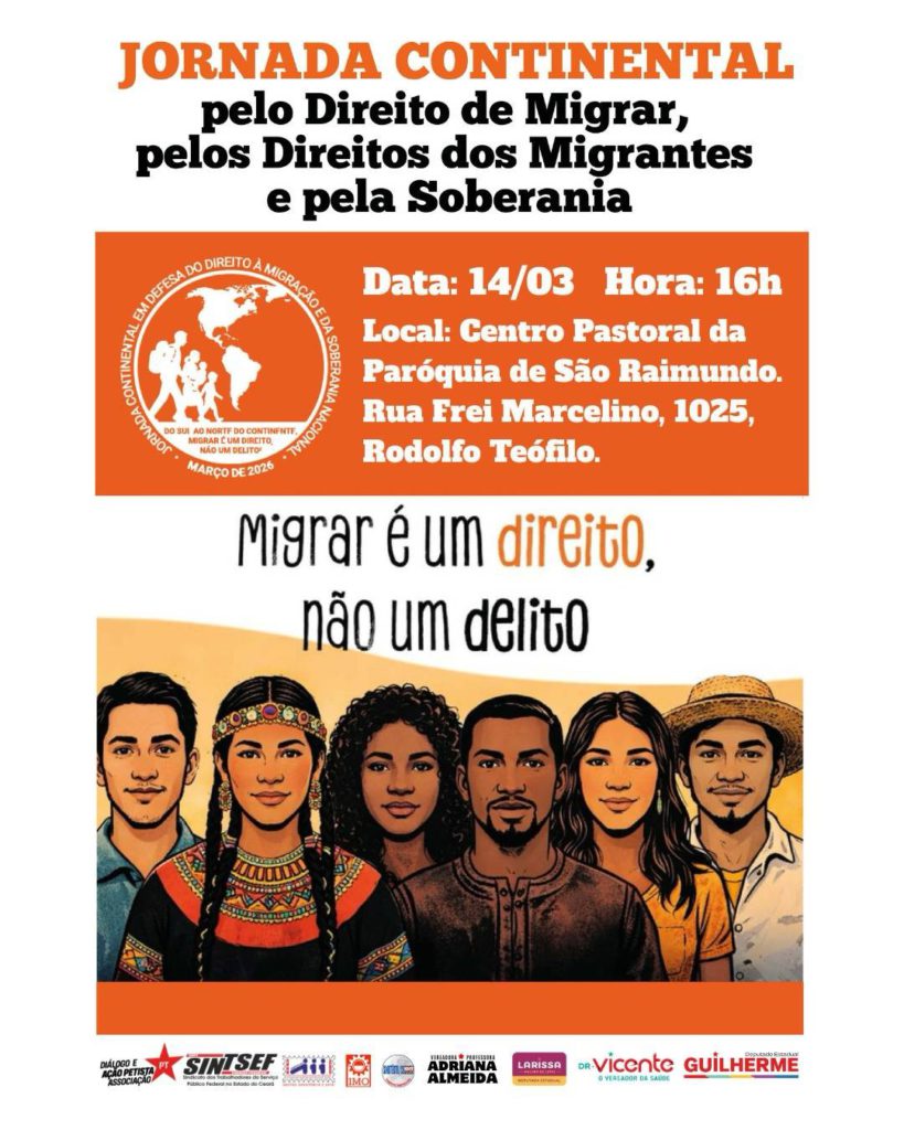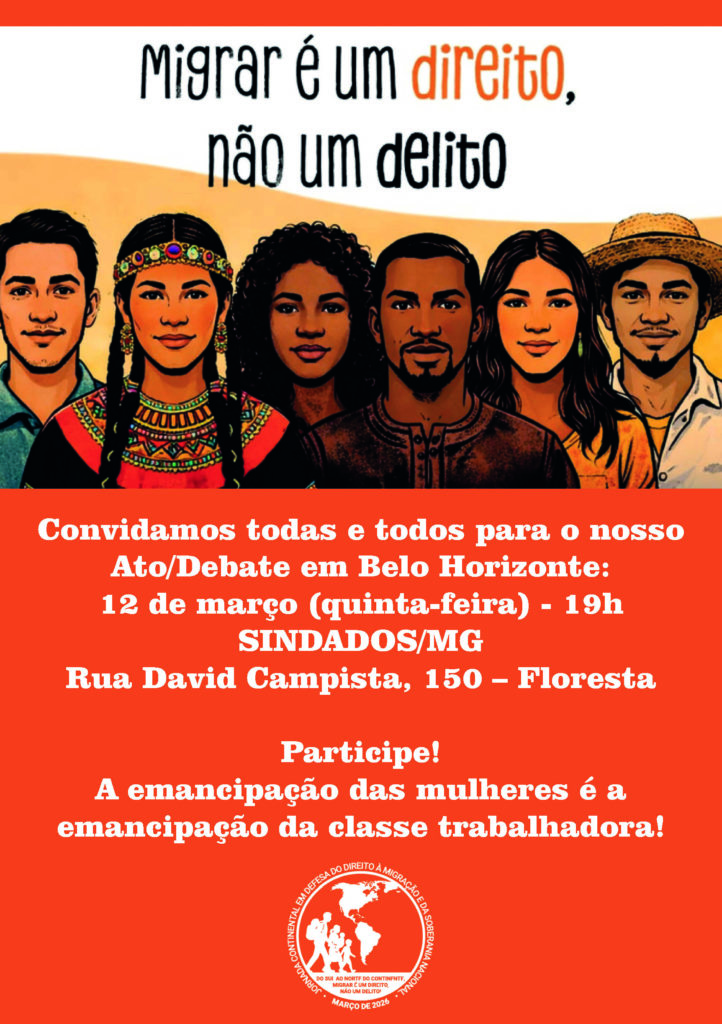 Trabalhadores e jovens, inclusive migrantes participarão entre os dias 9-14 de março, em várias cidades do Brasil, das atividades que integram a luta da Jornada Continental “Pelo direito à Migração e em defesa da soberania” decidida na Conferência internacional (México, setembro de 2025). Uma bandeira geral, o legítimo direito à migração, diz respeito também aos cidadãos brasileiros que, como outros, sofrem desta perseguição. Mais de 3 mil brasileiros foram deportados, somando-se ao dezenas de milhares de todo continente, além de outros milhares que fugiram e se auto deportaram para evitar as terríveis celas do ICE.